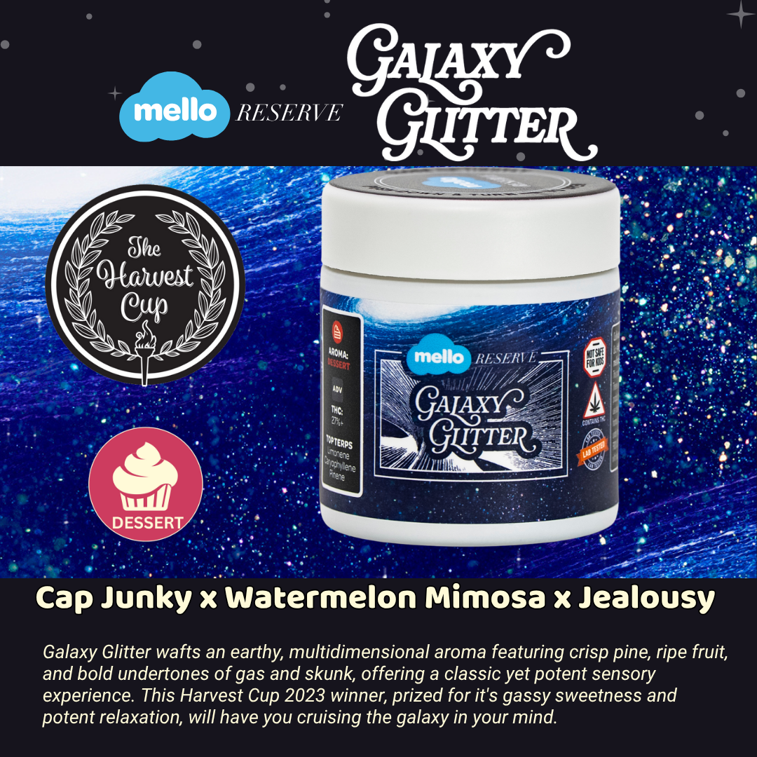 A few products consistently show up across the most locations. Galaxy Glitter 1g Pre-Roll | 5pk - Mello Cannabis (3 stores), Glitter Bomb 0.5g Pre-Roll | 7pk - Mello Cannabis (3 stores), and Lemon Pastry - 3.5g (3 stores).